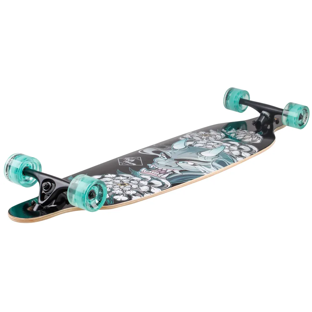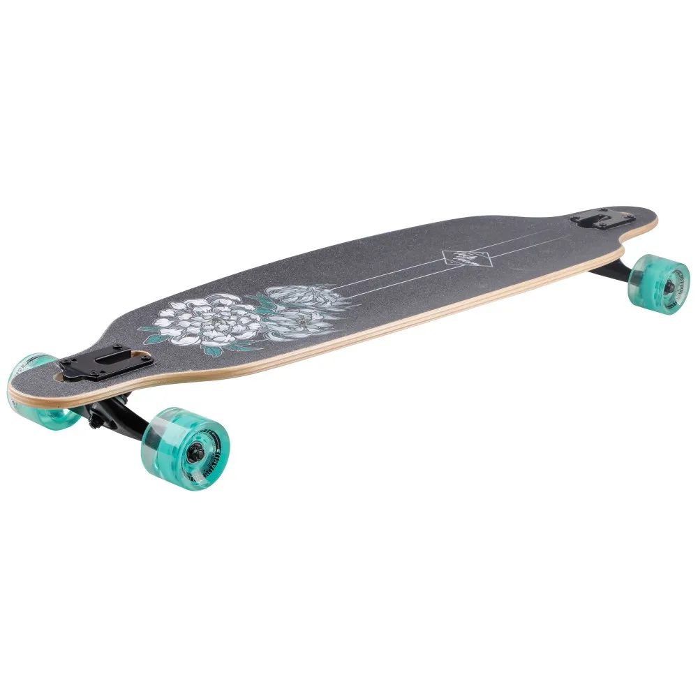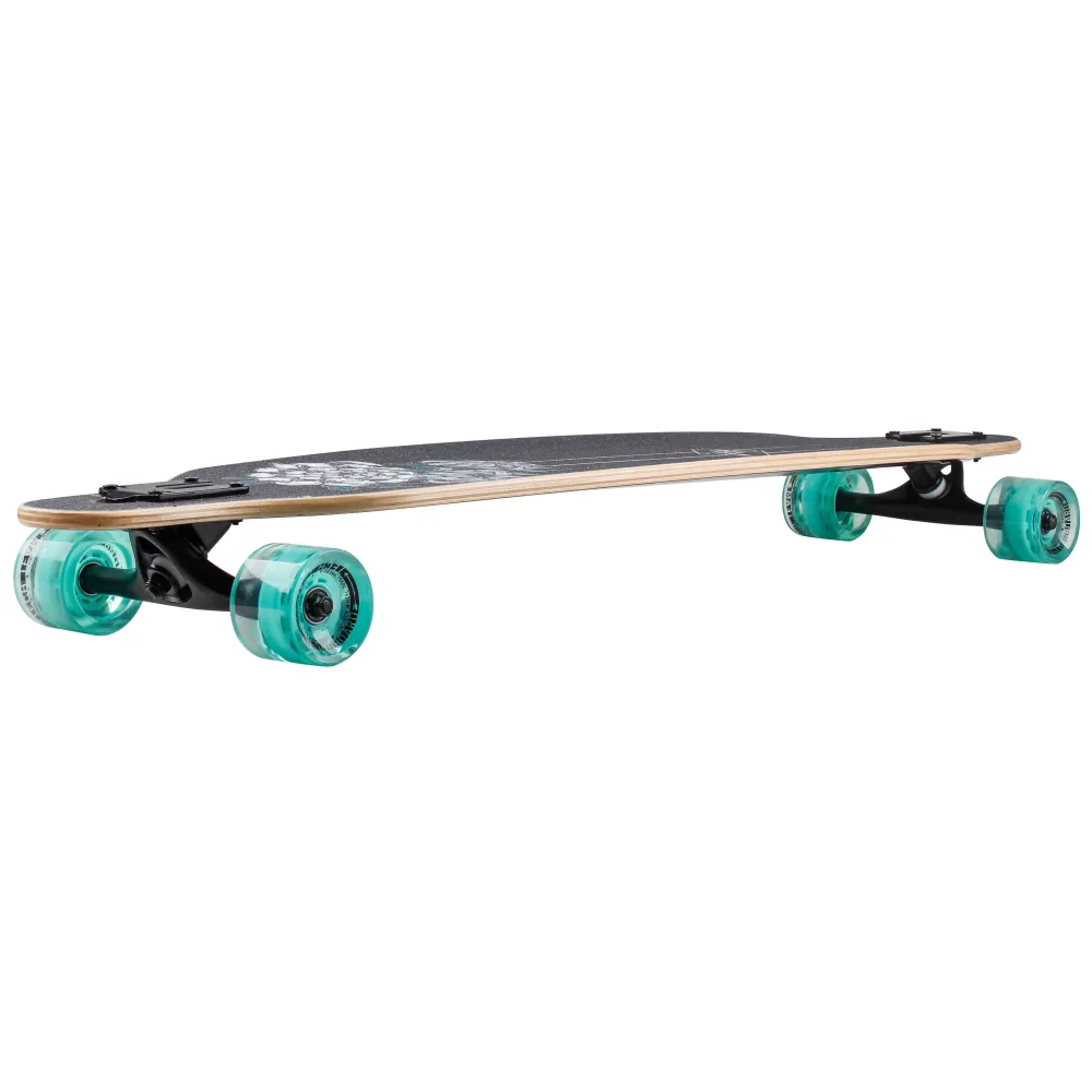 Дека имеет размеры 41 дюйм. Покрыта нескользящей брендовой шкуркой с принтом. Особенности деки минимизируют риски форс-мажорных ситуаций, полностью исключают соскальзывание ног райдера. 7-дюймовая подвеска из высокопрочного алюминия качественная и надежная.