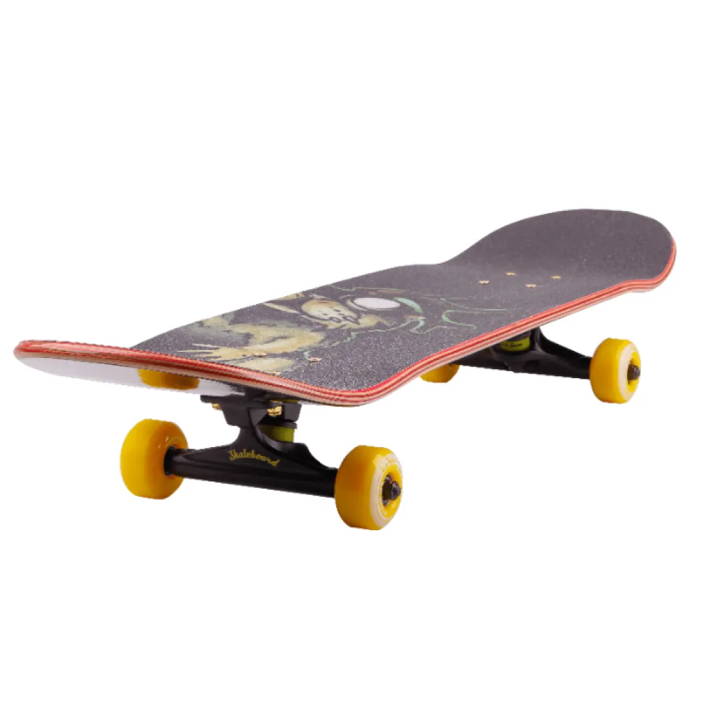 Доска изготовлена из прочного и надежного материала изготовления, оснащенного двойным кольцевым изгибом. Характеристики обеспечивают высокое качество трюков, прыжков и маневров. Высокая жесткость колес (диаметр 52 мм) обеспечивает стабильность, что важно при экстремальной езде. Дека представлена удобными размерами, покрыта шкуркой, исключающей случайное соскальзывание стоп. Амортизаторы с параметрами жесткости 100 обеспечивают плавность езды при преодолении проблематичной местности.